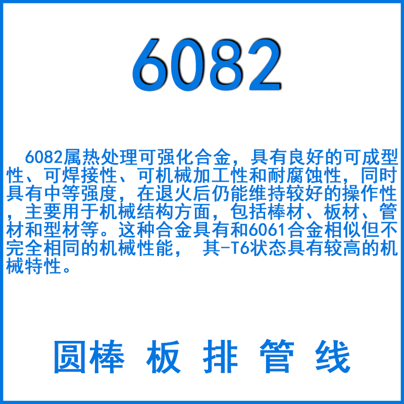 合金6082綜合了優(yōu)良的可焊性,銅焊性,抗腐蝕性,可成形性和機械加工性。合金6082的-0和T4狀態(tài)適用于彎曲和成形的場合,其-T5和-T6狀態(tài)適用于良好機械加工性的要求,有些特定加工需要使用切屑分離器或者其他特殊的工藝幫助分離切屑;6082合金通常具有很好的加工特性和很好的陽極反應(yīng)性能;廣泛用于機械零部件、鍛件、商務(wù)車輛、鐵路結(jié)構(gòu)件、造船等。