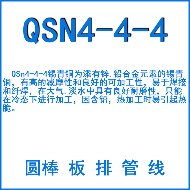 QSn4-4-4錫青銅為添有鋅.鉛合金元素的錫青銅,有高的減摩性和良好的可加工性,易于焊接和纖焊,在大氣.淡水中具有良好耐磨性,只能在冷態(tài)下進(jìn)行加工,因含鉛,熱加工時(shí)易引起熱脆。