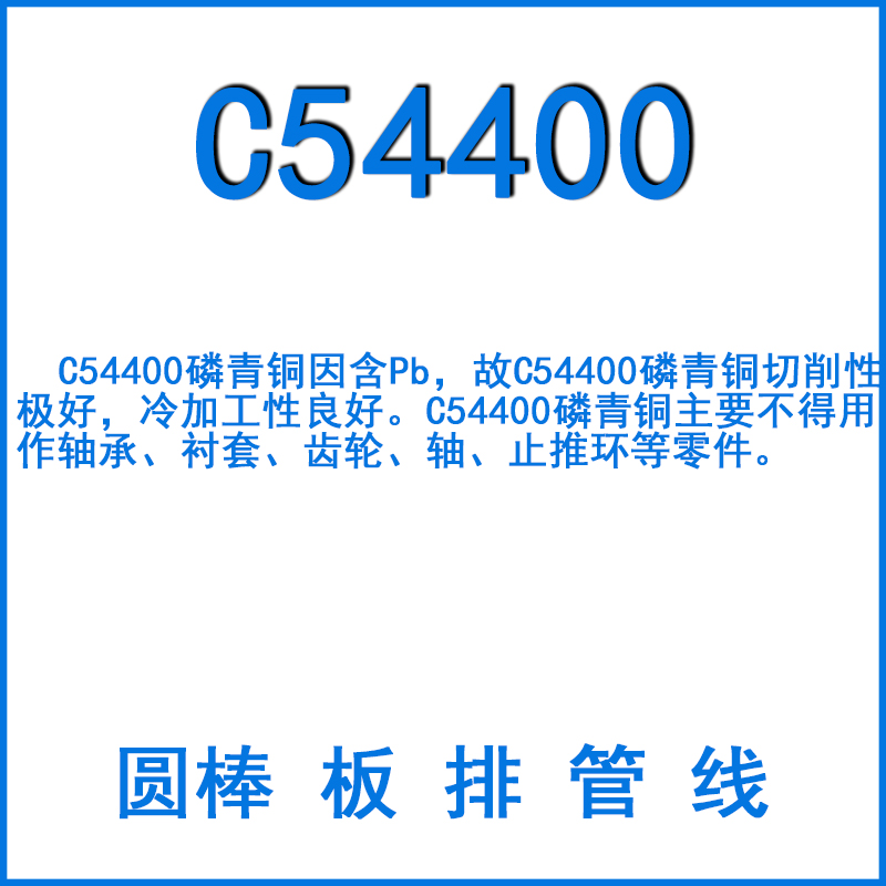 C54400磷青銅因含Pb,故C54400磷青銅切削性極好,冷加工性良好。C54400磷青銅主要不得用作軸承、襯套、齒輪、軸、止推環(huán)等零件。