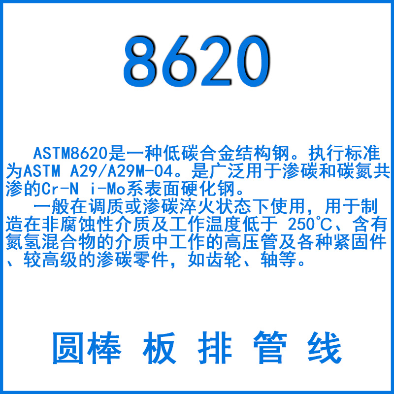 ASTM8620是一種低碳合金結(jié)構(gòu)鋼。執(zhí)行標(biāo)準(zhǔn)為ASTM A29/A29M-04。是廣泛用于滲碳和碳氮共滲的Cr-N i-Mo系表面硬化鋼。