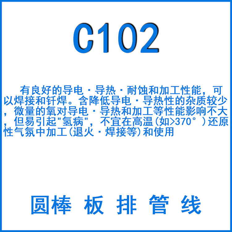 有良好的導(dǎo)電.導(dǎo)熱.耐蝕和加工性能,可以焊接和纖焊。含降低導(dǎo)電.導(dǎo)熱性的雜質(zhì)較少,微量的氧對導(dǎo)電.導(dǎo)熱和加工等性能影響不大,但易引起"氫病",不宜在高溫(如>370°)還原性氣氛中加工(退火.焊接等)和使用