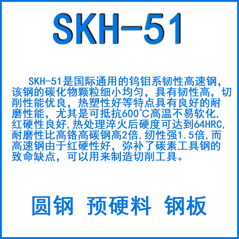 SKH-51是國際通用的鎢鉬系韌性高速鋼,該鋼的碳化物顆粒細(xì)小均勻,具有韌性高,切削性能優(yōu)良,熱塑性好等特點(diǎn)具有良好的耐磨性能,尤其是可抵抗600℃高溫不易軟化,紅硬性良好,熱處理淬火后硬度可達(dá)到64HRC,耐磨性比高鉻高碳鋼高2倍,紉性強(qiáng)1.5倍,而高速鋼由于紅硬性好,彌補(bǔ)了碳素工具鋼的致命缺點(diǎn),可以用來制造切削工具。